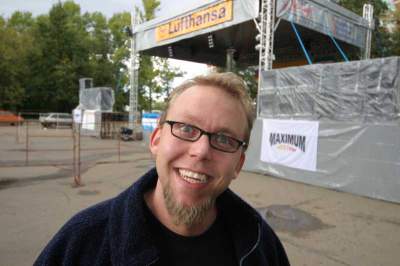 Zurück auf dem Parkplatz kam ein Man auf uns zu und fragte auf Englisch, ob wir die Jungs von Lekker wären. Ich muss an dieser Stelle wohl nicht gesondert erwähnen, daß wir diese Frage mit einem klaren "ja" beantworteten. Er begrüßte uns freundlich, stellte sich als Sergej vor und sagte, daß er zu dem Veranstalter-Team gehöre. Wir wollten natürlich sofort wissen, wo denn das Festivalgelände wäre. Er zeigte auf den leeren Parkplatz und sagte "hier". Ich fiel nun komplett vom Glauben ab. Schließlich sollte hier in weniger als 20 Stunden ein Festival mit angeblich 30.000 Besuchern stattfinden, und es war wirklich absolut nix zu sehen. Gar nix. Nur ein leerer Platz von der Größe zweier Fußballfelder. Auf meine Frage hin, wann denn die Bühne und das ganze technische Equipment käme, sagte Sergej nur, daß morgen Mittag garantiert alles fertig wäre. Auch unsere Fragen nach den Verstärkern und dem Schlagzeug für unseren Auftritt wurden mit einem klaren "das wird schon" beantwortet.