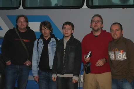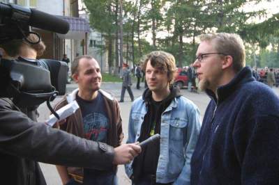 Wir bezogen also unser Quartier und taten das, was man immer vor Konzerten tut. Sich langweilen. Und warten. Und auf Toilette müssen. Jan und ich hatten dieses Problem, schauten uns suchend nach Möglichkeiten zum ungestörten Urinieren um und fanden - vier (!! in Zahlen: 4 !!) Dixieartige Plasteschränke, jeweils an den vier Ecken des Festivalgeländes postiert und natürlich mit langen Warteschlangen davor. Nach wenigen Minuten war das mit dem Warten aber schon vorbei, denn Akki kam in den Bus und sagte, daß wir ein Interview für eine Zeitung geben sollten. Wir baten den Interviewer also herein und, riefen Peter zu uns. Sonst konnten wir ja jar nüscht verstehen. Das Interview war recht nett. Der sichtlich nervöse Interviewer fragte uns nach unseren Eindrücken von Russland, nach unserer Eindrücken von Kasan, nach Russischen Bands, nach der Jugend in Deutschland, nach unseren Texten, nach Rammstein, nach Clubs in Berlin... Moment... Warum denn nach Clubs in Berlin?? Komische Frage... Konnten wir nicht beantworten. Dann wollte er noch wissen, ob House-Musik in Berlin angesagt ist. Konnten wir auch nicht beantworten. Schließlich kommen wir bekanntlich nicht aus Berlin und von House kriegen wir Ohrentumore.