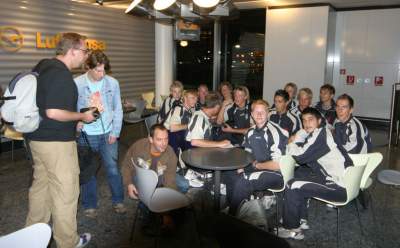 ![]() I n Frankfurt hatten wir fast 2 Stunden Aufenthalt. Vor dem Lufthansa-Schalter für den Flug nach Kasan trafen wir dann auf die A-Jugend der Eintracht Braunschweig Fußballer, die im Rahmen dieses Kulturaustausches gegen die Kasaner Jugendmannschaft antreten sollten. Die Jungs und ihr Trainer- und Beraterstab waren allesamt sehr nett und locker drauf. Es wurde also noch etwas mit den Jungs gequatscht und die Zeit bis zum erneuten einchecken überbrückt. Wir bekamen heraus, daß die Jungs das selbe Hotel hatten wie wir. Wir sollten also den gesamten Aufenthalt in Russland gemeinsam verbringen. Das muss nicht schlecht sein. Die Jungs waren schließlich echt nett.Wenig später checkten wir dann ein und um 21.55 Uhr sollte Flug LH3210 nach Kasan starten. Wir konnten jedoch nicht direkt ins Flugzeug steigen, sondern mussten erst noch mit einem Linienbus zum Standort des Fliegers gebracht werden. Ein kleiner, putziger Flieger war das. Ein Reisebus mit Flügeln quasi. Sehr süß. Im Flugzeug war schnell klar: das wird ein lustiger Flug!! Schließlich war, abgesehen von uns und den Fußballern, das Flugzeug quasi leer. Als wir (gemeinsam mit dem Flugzeug und der dazugehörigen Bordcrew) die Flughöhe erreicht hatten, verteilten wir uns auf die leeren Sitzreihen und machten es uns bequem. Das war super!! Die 6 Stunden Flug (inkl. kurzer Zwischenlandung in Samara) vergingen (und jetzt kommt das Mörder-Wortspiel) wie im Flug!! Kurz vor dem Zwischenstop in Samara verteilte die Bordcrew die russischen Zollformulare. Das war ein großer Spaß!! Keiner wusste nämlich, wie diese doch sehr verwirrenden Formulare auszufüllen waren. Auch die Stewardessen konnten uns nicht wirklich weiterhelfen (waren aber sehr bemüht!). Die waren nämlich auch zum ersten mal auf dem Weg nach Russland und kannten sich mit dem Zollkram nicht aus. Naja, nachdem sie von lauter Fußballern und ein paar stumpfen Musikern mächtig genervt wurden, werden sie jetzt sicher recht gut wissen, wie die Formulare auszufüllen sind.