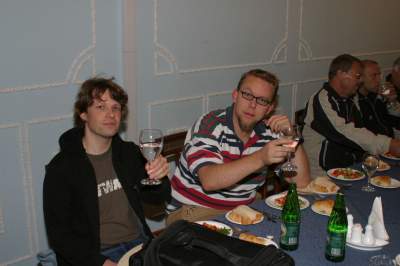Jan, Akki und ich ließen uns nicht lange bitten und setzten mit ein. Während des Essens kam Peter zu uns an den Tisch und teilte uns mit, daß die Veranstalter des Festivals gleich hier her kommen würden, um mit uns ein paar Dinge für morgen zu besprechen. Wenig später erschienen drei Herren (unter ihnen auch Sergej), setzten sich an einen freien Tisch im Restaurant und warteten auf uns. Wir schaufelten also zu Ende und setzten uns zu ihnen. Ein denkwürdiger Abend sollte nun beginnen... Nach einer kurzen Vorstellungsrunde hielt mir einer der Männer plötzlich die Speisekarte unter die Nase und fragte mich sehr freundlich (und zudem auf Englisch), was ich denn gerne essen würde. Ich war verwirrt, schließlich hatte ich den letzten Happen des Abendessens erst vor wenigen Augenblicken in meinem Magen gejagt. Ich lehnte also höflich ab. Der Mann ließ aber nicht locker und empfahl mir wieder sehr höflich einige Speisen aus der Karte, unter anderem etwas, das Dolmetscher Peter mit "aus Mund von Kuh" übersetzte. Ich verstand und lehnte wiederum ab. Zwar ist Essen eine meiner größten Fähigkeiten, aber wenn ich mir gerade ein opulentes Mahl einverleibt habe, ist auch erstmal gut. Auch Micha, Jan, Akki und Olli wurden nach ihren Essenswünschen gefragt. Und auch sie lehnten ab. Die Bedienung kam, und die russischen Herren bestellten sich offenbar was. Das nun beginnende Gespräch war eigentlich genau so ergiebig wie einige Stunden zuvor mit Sergej. Uns wurde versichert, daß alles klappen würde, und das wir uns keine Sorgen machen sollten. Und die Herren strahlten dabei so viel Zuversicht und gute Laune aus, das wir das einfach mal glaubten. Wir hatten ja auch kaum eine andere Wahl. Plötzlich erschienen zwei Bedienungen am Tisch und ehe wir uns versahen war der Tisch vollgestellt mit großen Wurstplatten, Brot und zwei Flaschen Vodka. Wir waren etwas verunsichert. Ohne groß zu fragen wurden unsere Gläser (es waren übrigens stinknormale Schnappsgläser) mit dem hochprozentigen Nass gefüllt, anschließend wurde für jeden ein großes Weinglas mit Traubensaft gefüllt und wir wurden parallel dazu aufgefordert zu essen. Nun denn. Da sitzt man also als armer deutscher Musiker und weiß gar nicht so recht, wie man sich denn nun zu verhalten hat, bzw warum wir denn Traubensaft eingeschenkt bekommen, nach dem wir gar nicht gefragt haben. Klar war, daß wir nicht unhöflich scheinen wollten. Schließlich waren die drei Herren allesamt überaus nett und sympathisch. Es sei erwähnt, daß Micha, Jan und ich uns leider überhaupt nicht an deren Namen (bis auf Sergej) erinnern können. Und wir bedauern das ehrlich. Wir begannen also ein wenig zu essen und schon erhob einer der Herren sein Vodkaglas. Ach Du Scheisse!! Jetzt ist es zweifellos soweit: Wir "müssen" Vodka trinken. Au-weia. Was nun? Ablehnen? Können wir nicht bringen... Auf den Boden schütten? Fällt auf... Plötzlichen Herzstillstand vortäuschen? Nimmt uns keiner ab... Das Motto hieß folglich: Augen zu (und zwar fest) und durch. Beim ersten mal tut‘s noch weh. Beim zweiten mal nicht mehr so sehr. Jan und Micha haben in Sachen Alkoholismus ja etwas mehr Erfahrung. Für mich, der quasi nie Alkohol trinkt, war das schon was anderes. Das Zeug brannte mir fast die Fresse weg und schmeckte grauenvoll. Ich hielt es demnach für das Beste, den Leuten jetzt schon mal ehrlich zu sagen, daß ich wirklich noch nie sowas getrunken habe. Ich hoffte sie würden ein Einsehen mit mir haben und mir verzeihen, wenn ich keine weiteren dieser Mördergeräte trinken würde. Inzwischen hatten sich sehr angeregte Gespräche kreuz uns quer über den Tisch entwickelt. Schließlich sprachen sie alle drei ein sehr gutes Englisch. Die Themen waren schnell gefunden: was geht so in Russland / was geht so in Deutschland. Zwischendurch wurde von Sergej wieder der Vodka nachgeschenkt. "Na", dachte ich mir "einen kannste ja noch". Micha und Akki begannen ein wenig zu nerven. Schließlich wollten sie unbedingt noch in die Stadt und das Kasaner Nachtleben ausprobieren. Jan und ich hingegen hatten darauf keinen Bock und amüsierten uns sehr gut mit den drei Veranstaltern. Letztendlich zogen Micha und Akki alleine los. Olli war schon längst pennen gegangen. Die nächsten paar Vodka wurden gekippt. Ich hatte mich inzwischen meinem Schicksal gefügt: heute würde ich zum ersten Mal in meinem Leben hacke sein. Mir wurde klar, daß ich einen solchen netten Abend mitten in Russland mit so netten Leuten wohl nie wieder erleben würde. Und irgendwann muss man schließlich mal hacke gewesen sein. Attacke! Der Traubensaft war des Rätsels Lösung! Den trinkt man nämlich direkt nach dem Vodka. Somit wird der fiese Nachgeschmack auf der Stelle gekillt. Die Gespräche wurden interessanter und inzwischen kamen wir fünf blendend miteinander aus. Wir tauschten uns immer weiter über unsere Heimatländer aus und konnten gegenseitig einige Vorurteile (wenn man das so nennen will) aufklären. Zwischendurch wurde immer mal wieder ein Happen gegessen und... nun ja... Vodka getrunken. Aber: vor jedem Vodka wurden prinzipiell die Gläser erhoben und ein Trinkspruch zum besten gegeben. Erst dann haben alle zusammen getrunken. Einfach saufen war nicht angesagt. Es hatte schon ein wenig Stil. Ich merkte langsam, wie mein Blick etwas verschwommener wurde und meine Feinmotorik ließ ebenfalls ein paar Wünsche offen. Aber egal. Den Weg in den vierten Stock zu unserem Zimmer würde ich schon noch hinkriegen. Außerdem funktionierte mein Sprachorgan noch ganz augezeichnet. Alles war gut. Jan trank natürlich fleißig mit und ich erzählte ihm heimlich von meinen ersten Funktionsstörungen. Ich kannte sowas ja nicht. Er grinste mich aber nur frech an und freute sich offenbar über seinen leicht angeschossenen Bandkollegen. Nach drei geleerten Vodkaflaschen war die Stimmung großartig. Schließlich waren auch Sergej und seine beiden Kollegen inzwischen reichlich breit. Es wurde nur noch
