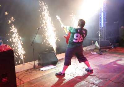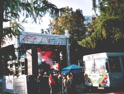 Wo gestern noch gähnende Leere herrschte, stand nun tatsächlich eine verdammt schicke große Bühne! Hurra! Mit einem Schlag waren alle Zweifel vergessen und wir alle saßen breit grinsend in dem Sprinter, der nun direkt neben die Bühne rollte. Als wir ausstiegen, hörten wir, daß die Band, die da oben gerade am checken war, auch noch einen verdammt guten Sound hatte. Yes!! Das machte wirklich alles einen verdammt guten Eindruck. Das breite Grinsen wollte mein Gesicht gar nicht mehr verlassen. Es war einfach nur schön!! Von weitem erspähte ich einen der Jungs, mit denen wir gestern noch so herrlich gefeiert hatten. Mit einem "ich-hab’s-dir-doch-gesagt"-Grinsen kam er auf mich zu. Wir begrüßten uns herzlich und ich hatte große Mühe, meiner Freude über diese tolle Bühne entsprechenden Ausdruck zu verleihen. Wir stellten unsere Sachen in den Backstagebereich, sahen uns die Band an, die gerade auf der Bühne war und beobachteten das Treiben auf dem Parkplatz. Nicht wenige Polizisten hatten sich schon auf dem Platz versammelt und hatten offenbar gerade eine Einsatzbesprechung. Uns war fast schon klar, daß das hier alles wohl etwas strenger abgehen würde, als wir es von zu Hause kennen. Kurz bevor wir zum Soundcheck auf die Bühne durften, ging eine Polizistin mit Drogenhund auf die Bühne und ließ ihren Waldi ordentlich schnuppern. Ich fand das sehr bizarr. Außerdem habe ich mich gefragt, was wohl passiert wäre, wenn sie was gefunden hätte. Aber es wurde natürlich nichts gefunden. Nun durften wir endlich zum Soundcheck auf die Bühne. Tatsächlich hatte man auch ein paar ordentliche Verstärker und ein gutes Schlagzeug für uns besorgt. Nun war also endgültig alles absolut wunderbar. Der Soundcheck war kurz und knackig. Der Sound war brilliant und fett. Keine weiteren Fragen unsererseits. Alles super. Danke. Nun hatten wir also noch etwas Zeit bis zum Beginn unserer Show. Leider gab es keine Garderobe o.ä. für uns, wo wir uns hätten hinsetzen können. Also hockten wir uns auf eine Mauervorsprung am Flughafengebäude uns genossen die letzten Sonnenstrahlen des Tages. Inzwischen hatten sich nämlich sämtliche Wolken verzogen und der Himmel strahlte wieder hellblau über der Stadt.